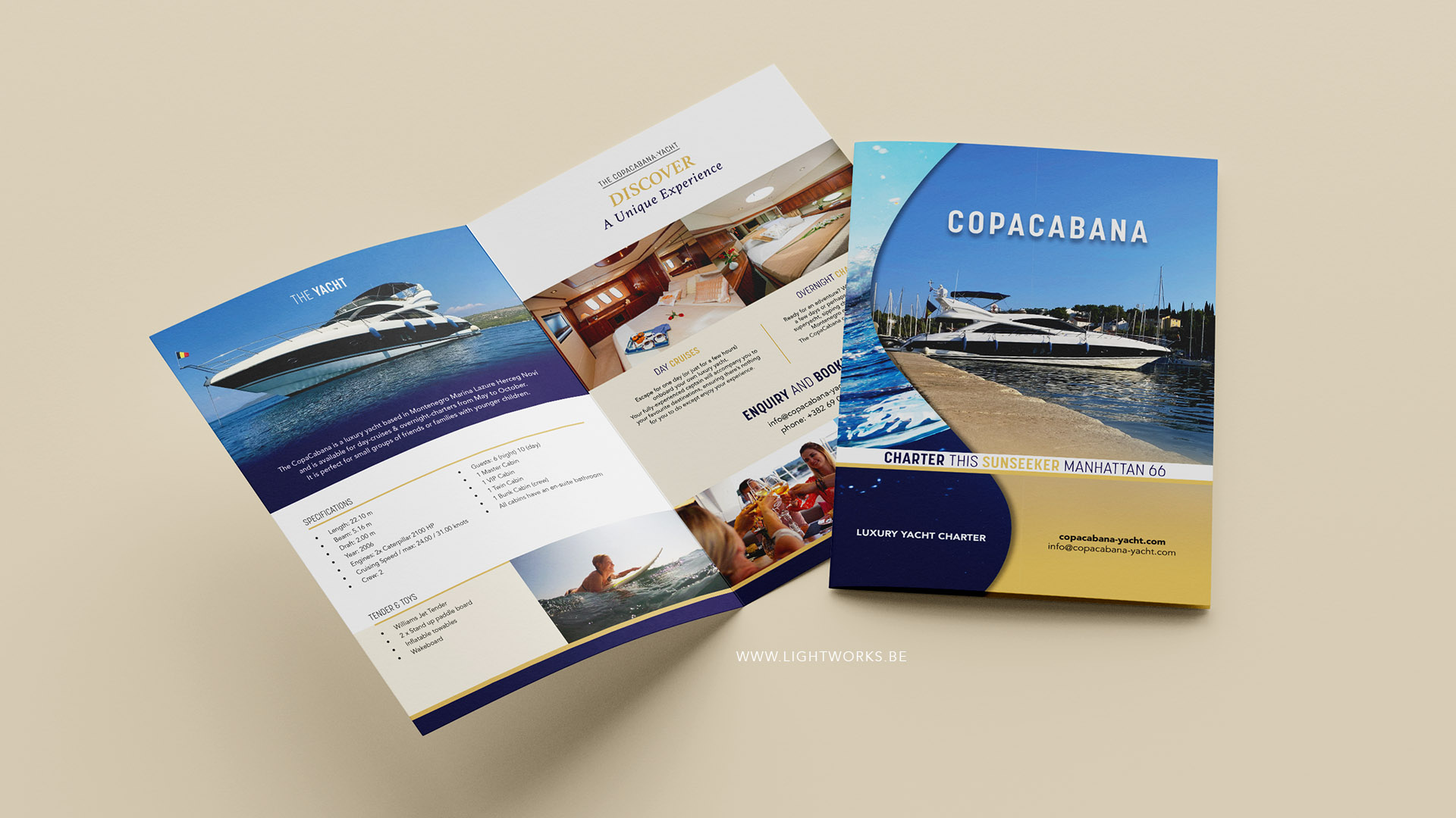 De CopaCabana is een luxe privéjacht met als thuisbasis Montenegro en kan gehuurd worden voor één- of meerdaagse cruises. Het is uitermate geschikt voor een verblijf onder vrienden of families met jonge kinderen. Wij realiseerden de nieuwe website, naamkaartjes en promo-folder.